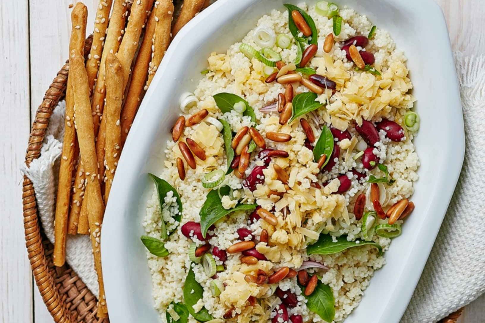 A quinoa, fenyőmag, zöldhagyma és a fenséges Edam sajt pompás, egészséges és könnyű kombinációja.